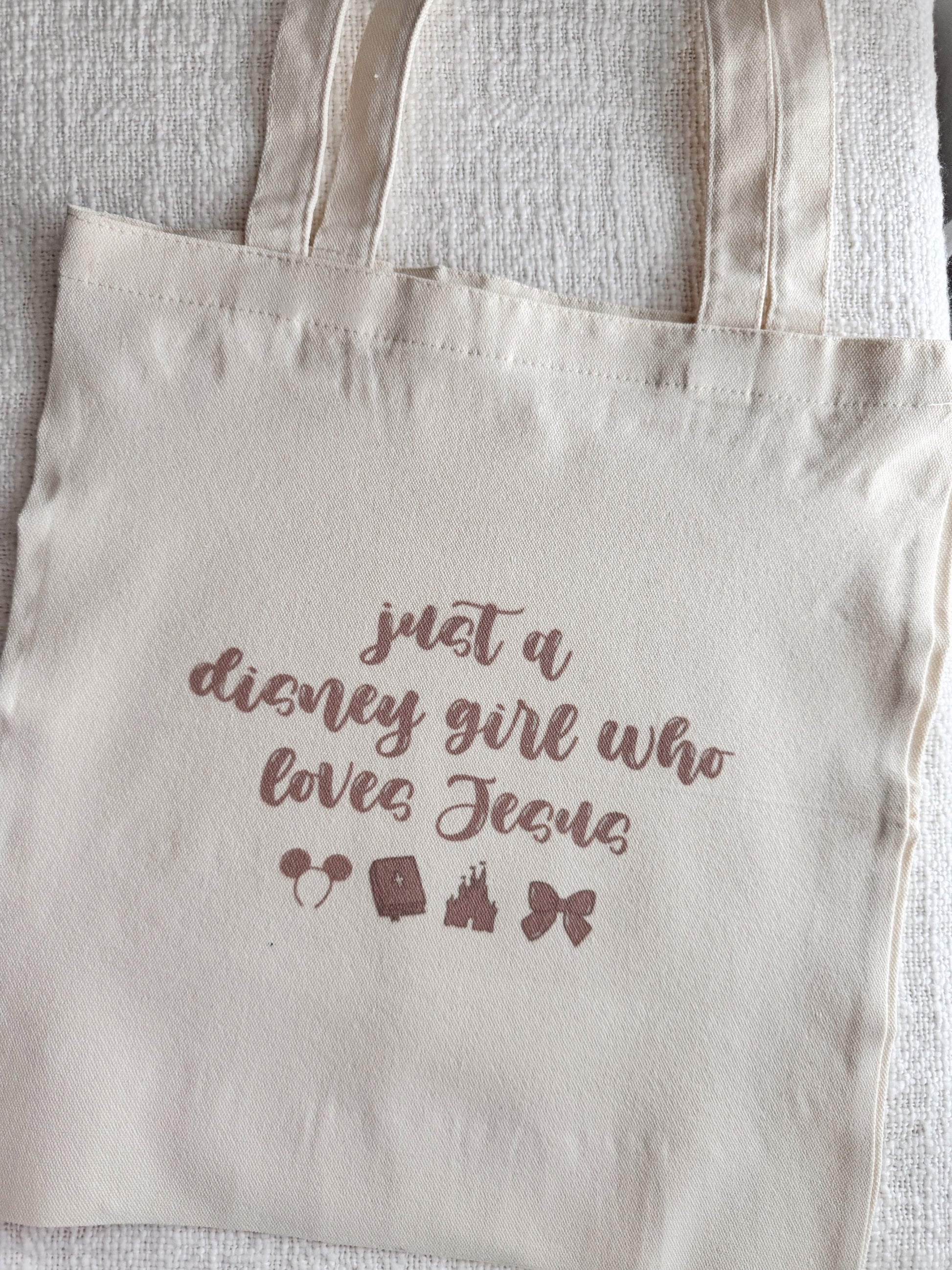 Tote bag with the saying "Just A Disney Girl who Loves Jesus"
